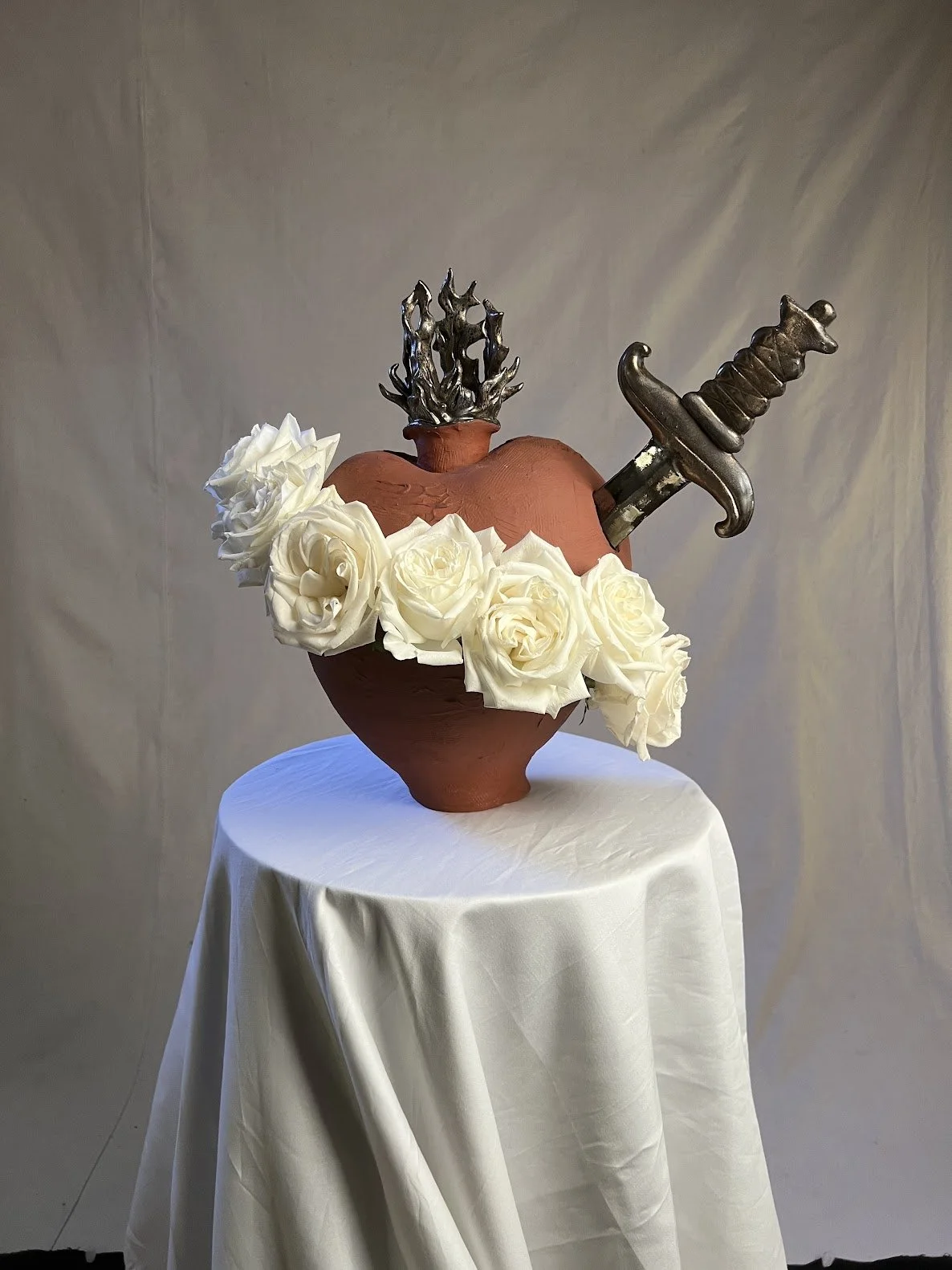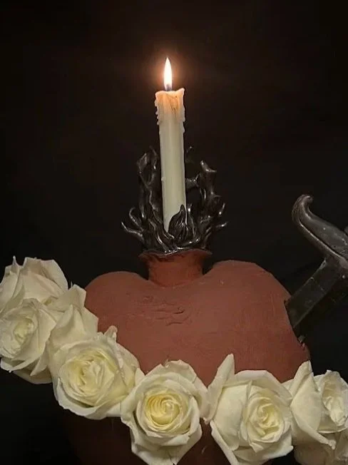 Clay, water, wax, flame, live roses